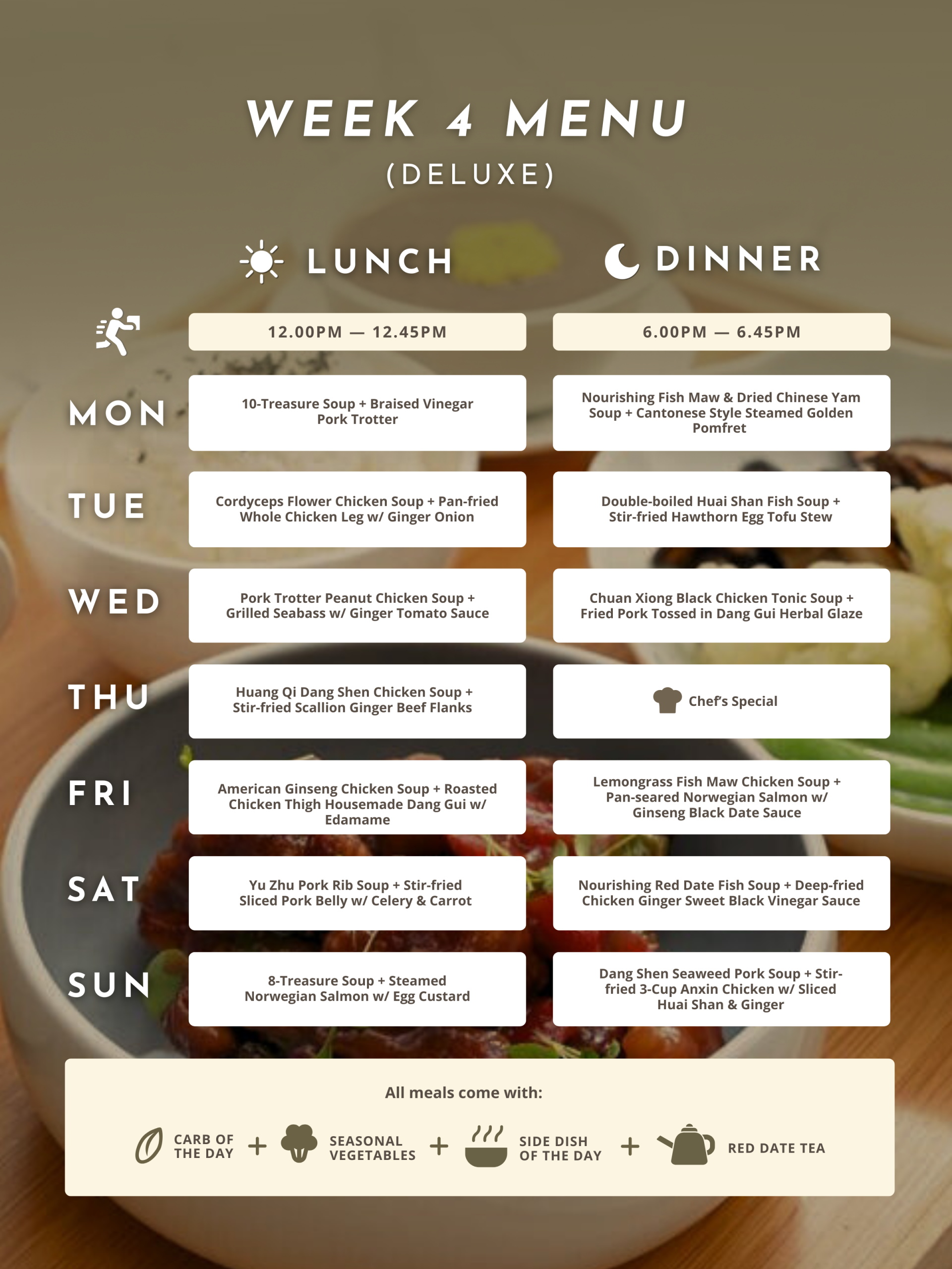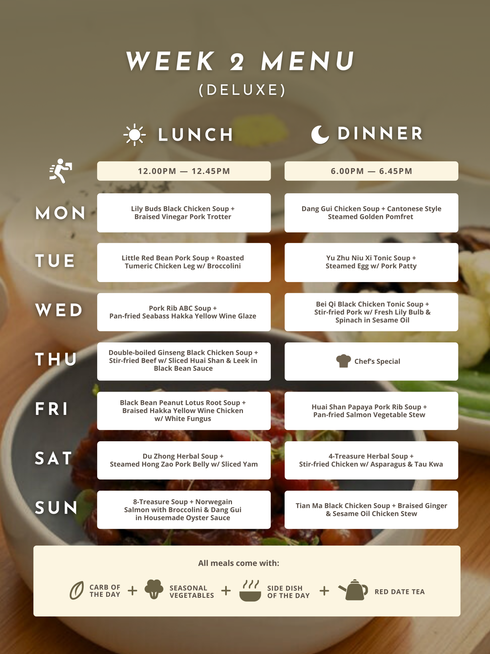 For 28 days, immerse yourself in a comprehensive confinement experience with daily lunch and dinner delivery. This extended plan provides thorough support for recovery, replenishes your energy, and promotes long-term wellness, making it an excellent choice for full confinement care.